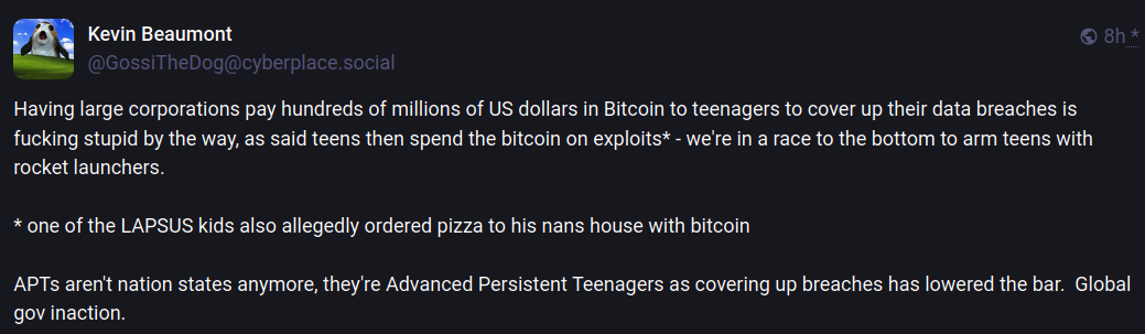 A Mastodon post by Kevin Beaumont, lamenting the prevalence of major companies paying millions to extortionist teen hackers, refers derisively to Thalha Jubair as a part of an APT threat known as “Advanced Persistent Teenagers.”