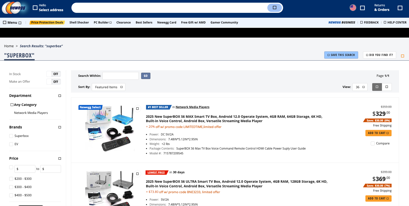 A quick online search shows various Superbox models and many similar Android streaming devices for sale at a wide range of top retail destinations, including Amazon, BestBuy, Newegg, and Walmart. Newegg.com, for example, currently lists more than three dozen Superbox models. In all cases, the products are sold by third-party merchants on these platforms, but in many instances the fulfillment comes from the e-commerce platform itself.