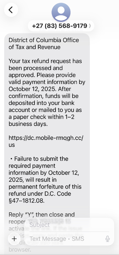 A text message that spoofs the District of Columbia’s Office of Tax and Revenue.
