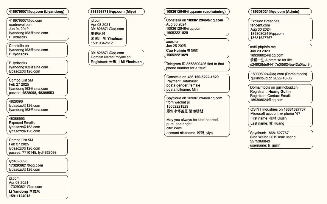 The very first account listed in the Badbox 2.0 panel — “admin,” registered in November 2020 — used the email address 189308024@qq.com. DomainTools shows this email is found in the 2022 registration records for the domain guilincloud[.]cn, which includes the registrant name “Huang Guilin.”
