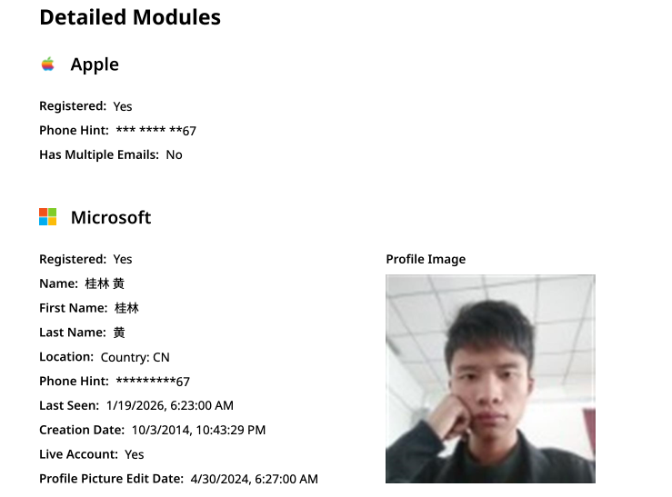 Constella finds 189308024@qq.com is associated with the China phone number 18681627767. The breach tracking service osint.industries reveals this phone number is connected to a Microsoft profile created in 2014 under the name Guilin Huang (桂林 黄). The cyber intelligence platform Spycloud says that phone number was used in 2017 to create an account at the Chinese social media platform Weibo under the username “h_guilin.”